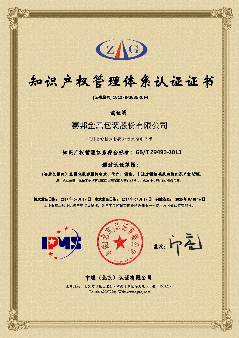 2017年7月17日,赛邦股份正式获得《知识产权管理体系认证证书》,由此成为率先通过国家知识产权局《企业知识产权管理规范》认证的企业之一,目前成为金属包装行业唯一通过认证企业。